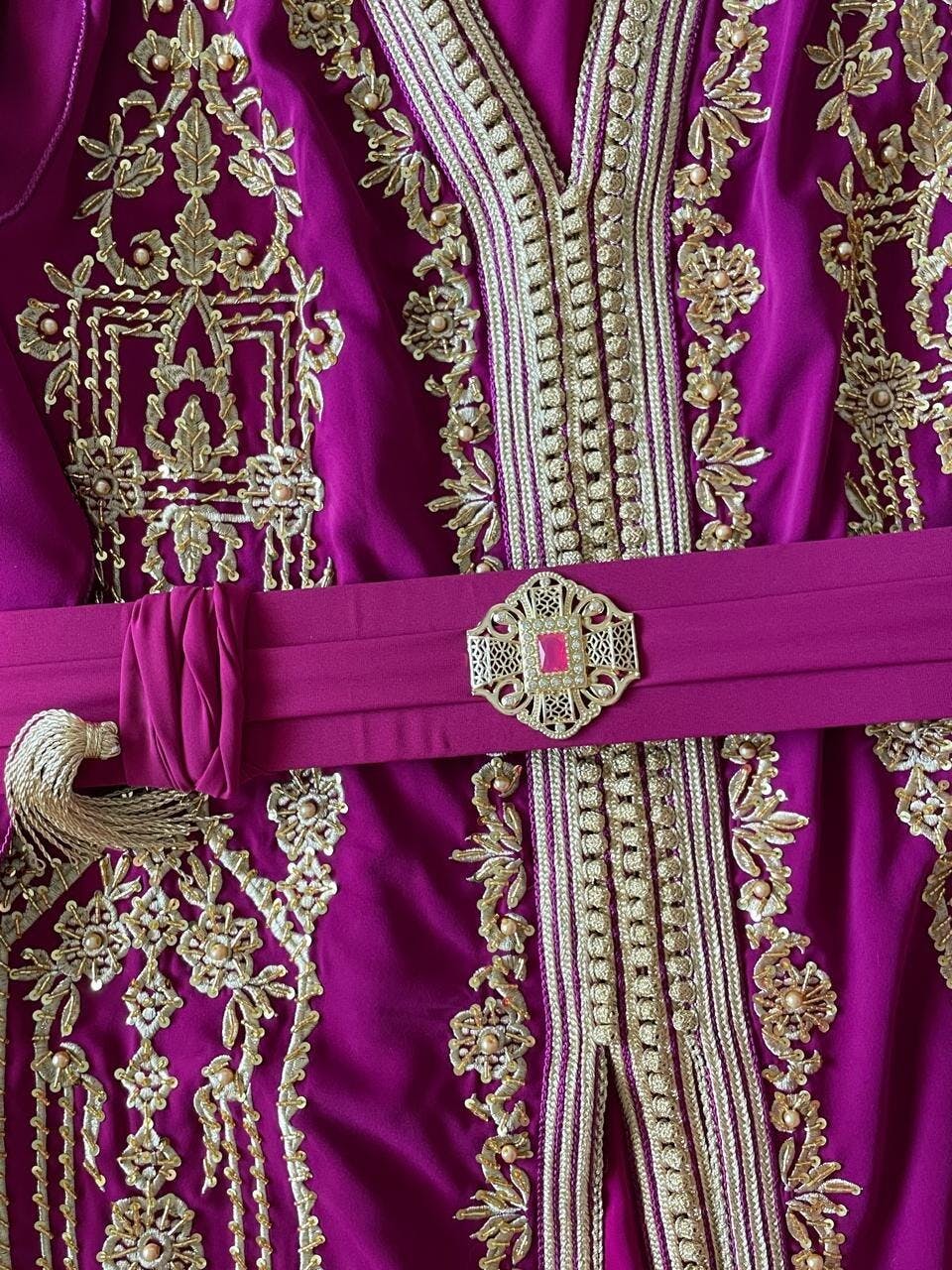Step into regal elegance with this Moroccan kaftan in a majestic deep purple, adorned with intricate gold embroidery and delicate detailing. The rich, royal hue paired with exquisite embellishments captures the essence of Moroccan luxury and sophistication.